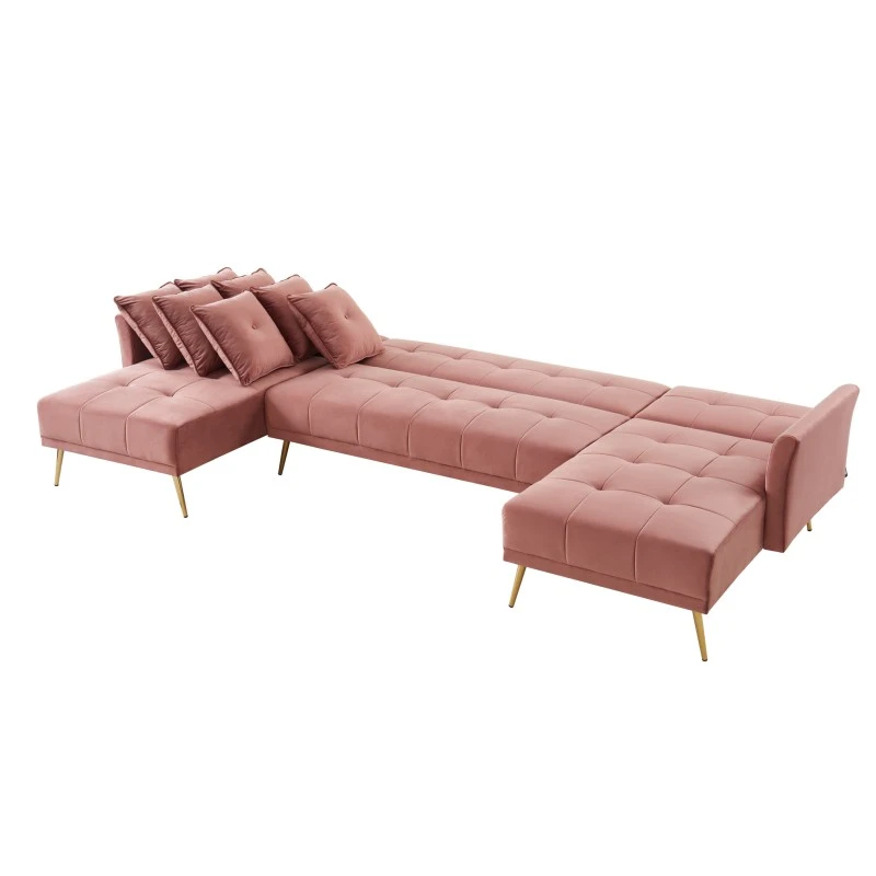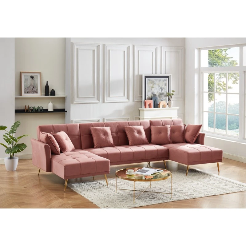 Pour un intérieur chic et élégant craquez pour le canapé panoramique AROMA 6 places ! Laissez vous séduire par ses détails capitonnés, ses pieds dorés et son velours.