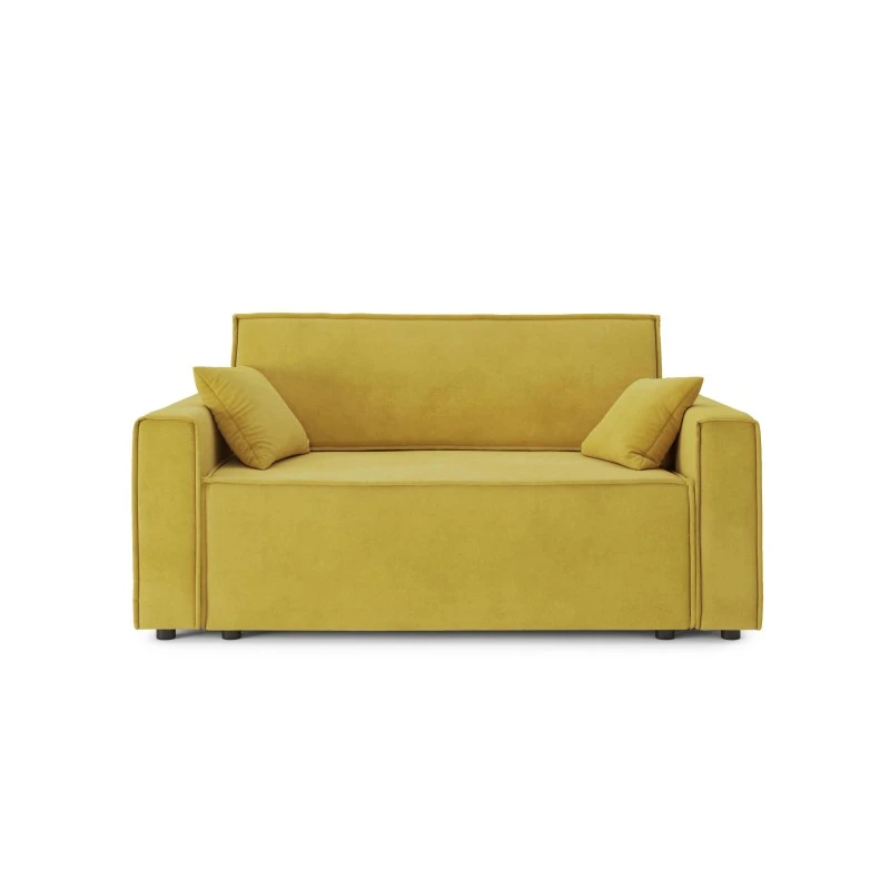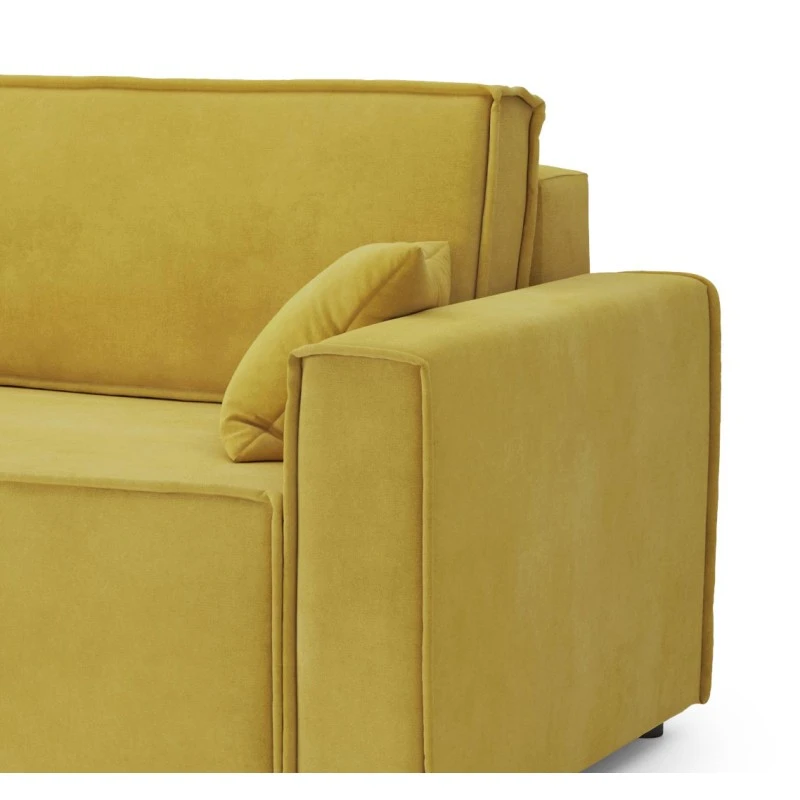Son revêtement en tissu, ses accoudoirs carrés et son format généreux sont ses vrais atouts tendance.