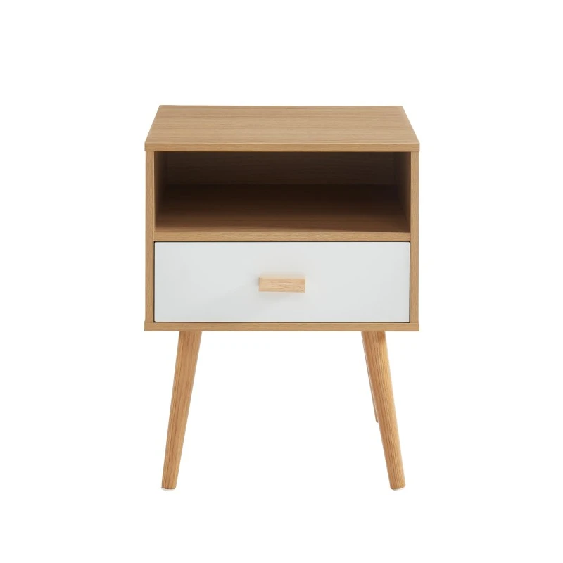 Table de chevet ULOS – Structure en panneaux de particules – Revêtement en papier décor bois et blanc – 1 tiroir de rangement – Pieds en bois massif de pin – Dimensions : L40 x P39,5 x H50cm