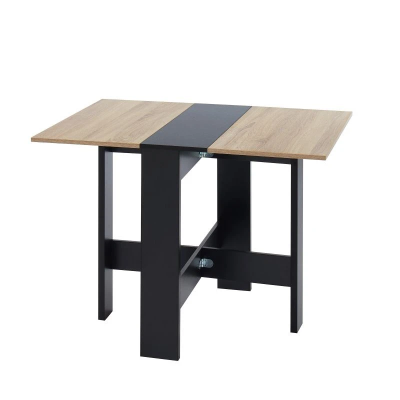 Table pliante JUNO – Structure en panneaux de particules d’épaisseur 15 mm – Revêtement mélaminé noir et chêne – Dimensions ouverte : L104 x P76 x H74 cm / fermée : L24 x P76 x H74 cm.